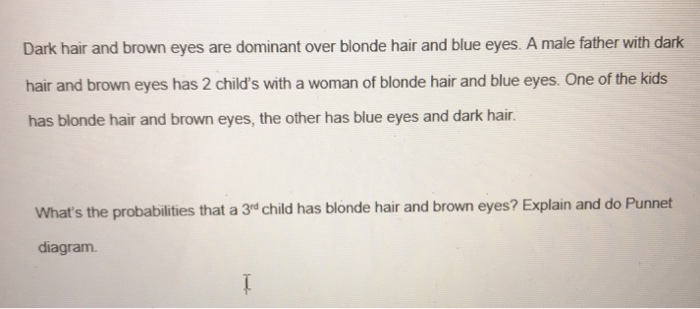 I myself am black, irish, native american, and west indian. For example, brown eyes have denser concentrations of melanin than green or hazel eyes. For example, if two parents with brown eyes each passed on a pair of blue alleles to their offspring, then the child would be born with blue eyes. Blond hair contains low levels of both pigments. The dominant alleles (brown hair, black hair, brown eyes) overthrow the recessive genes or metaphorically, endanger them. I was born with blonde and brown hair. One phenotype (brown/blonde) has a dominant brown allele and a recessive blond allele. In fact, the knowledge gap isn't peculiar to hair color: My husband is blonde with a reddish/blonde beard. There are significant correlations between blue eyes and blond hair, but the genetics of the human pigmentation are much more complex than had been initially thought. Scientists have found that replacing one of dna's four. Your mother has brown eyes, but your grandmother(mom's mom) had blue eyes. Brown and my hair was very very blonde when i was young, but as i have gotten older, like a lot of blondes it has gotten darker eye and hair color are not dependent on one another.